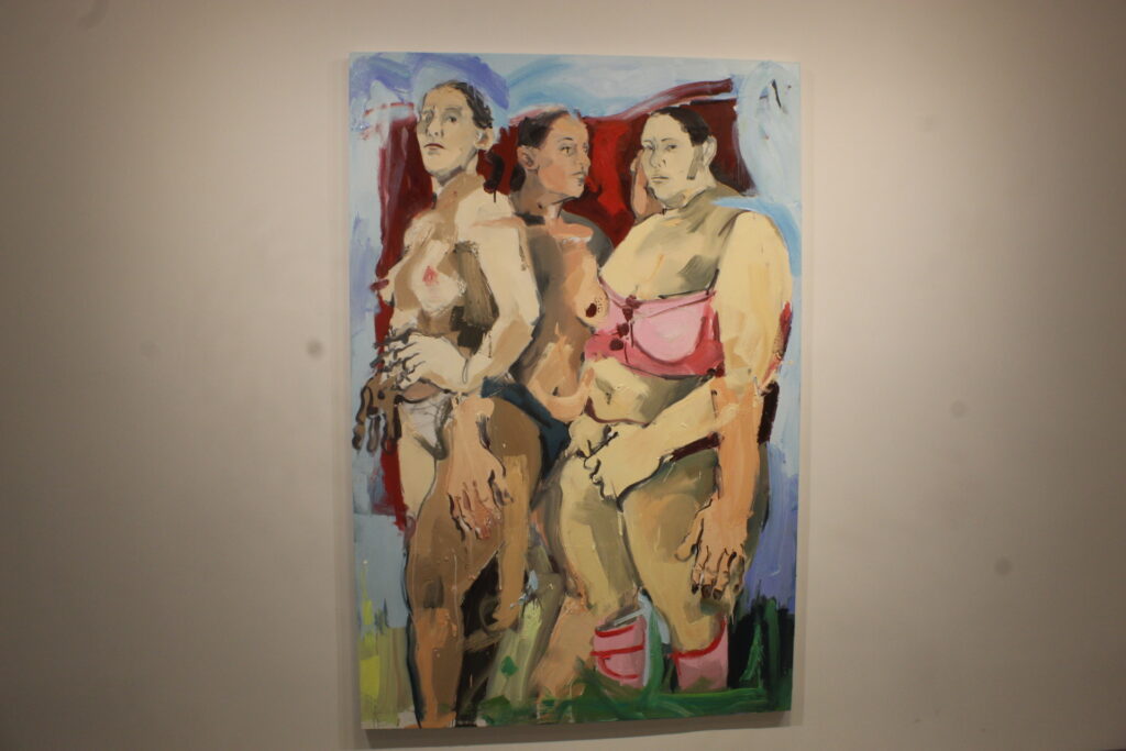Separation from this construct made Social Practice refreshing, even if slightly frustrating. The last time I’d been to AMANITA, it was for a solo exhibition by Louis Osmosis, a thoughtful Brooklyn sculptor whose work melds hypebeast irony with heavy social critique. Compared to then, the floor looked empty—spatially, because there were, of course, no lofty sculptures, but also thematically, because there wasn’t any obvious connective tissue linking the paintings. The gallery is something of a flashy rectangle, too wide to be a hallway but too modest to be overwhelming. Stationed on opposing walls, the works were well-dressed partygoers, colorful and interesting in their own right, though still doomed to make awkward eye contact from their respective sides of the room. In one such pairing, Robert Nava’s Weekend Crunch (2020), which portrays an alligator attack in childlike impasto, sat directly across from Cristina BanBan’s Tres dones amb la roba estesa (2024), a portrait of three nude women à la GTA 5. Elsewhere, Christina de Miguel’s Lana (2024) foregrounded an androgynous body with an angry, amorphous face; some feet away, its partner in eye-contact was En Plein Air (2023), a Marco Pariani work that took its counterpart’s disfiguration, colored it black, and lugged it into the crude, unsettling universe of Jean-Michel Basquiat. Only one piece was left without a staring partner, and somewhat poetically, this “end” of the rectangle was a window—looking out, through crudely-painted panels, across Paul Cooley’s pinkish Bushwick neighborhood. It looked like something Kevin from Split might have in his bedroom.